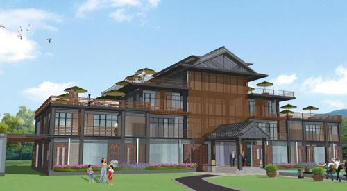 度假酒店周邊環(huán)境整體設(shè)計風(fēng)格定位為簡約大氣。度假酒店前保留一定的草坪面積,使酒店一層窗口有比較開闊的視野和較好的采光。